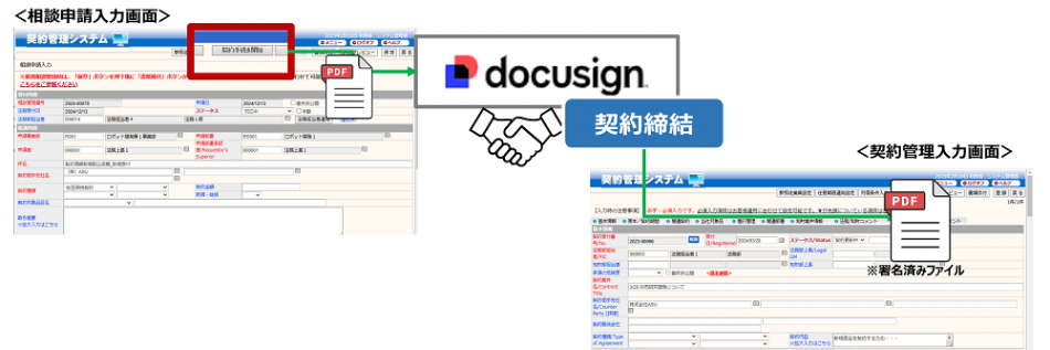 契約管理システムContractEyesにおきまして、電子契約サービス「DocuSign連携」機能をリリースしました! 相談申請機能からスムーズに「Docusign」へ書類を送信できます。 「Docusign」上で押印した後は自動的にContractEyesの書類添付へ連携されます。 デモも可能ですので、ご興味のあるお客様はお申し付けください!