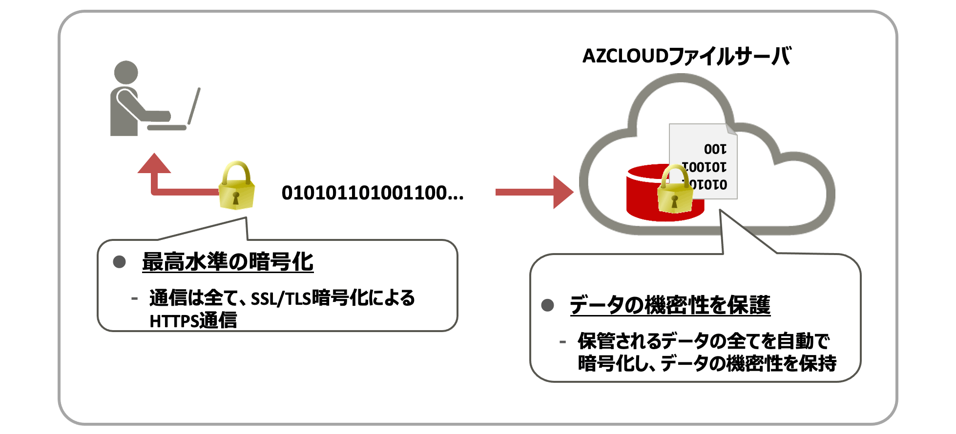 クラウドストレージサービスは、ビジネス現場に欠かせない様々なデータを保管する場となります。それらの重要情報の喪失や漏洩といったリスクを徹底して排除すべく、クラウドから通信経路、端末上に至るまで全てのファイルデータを複数レイヤーで暗号化しています。