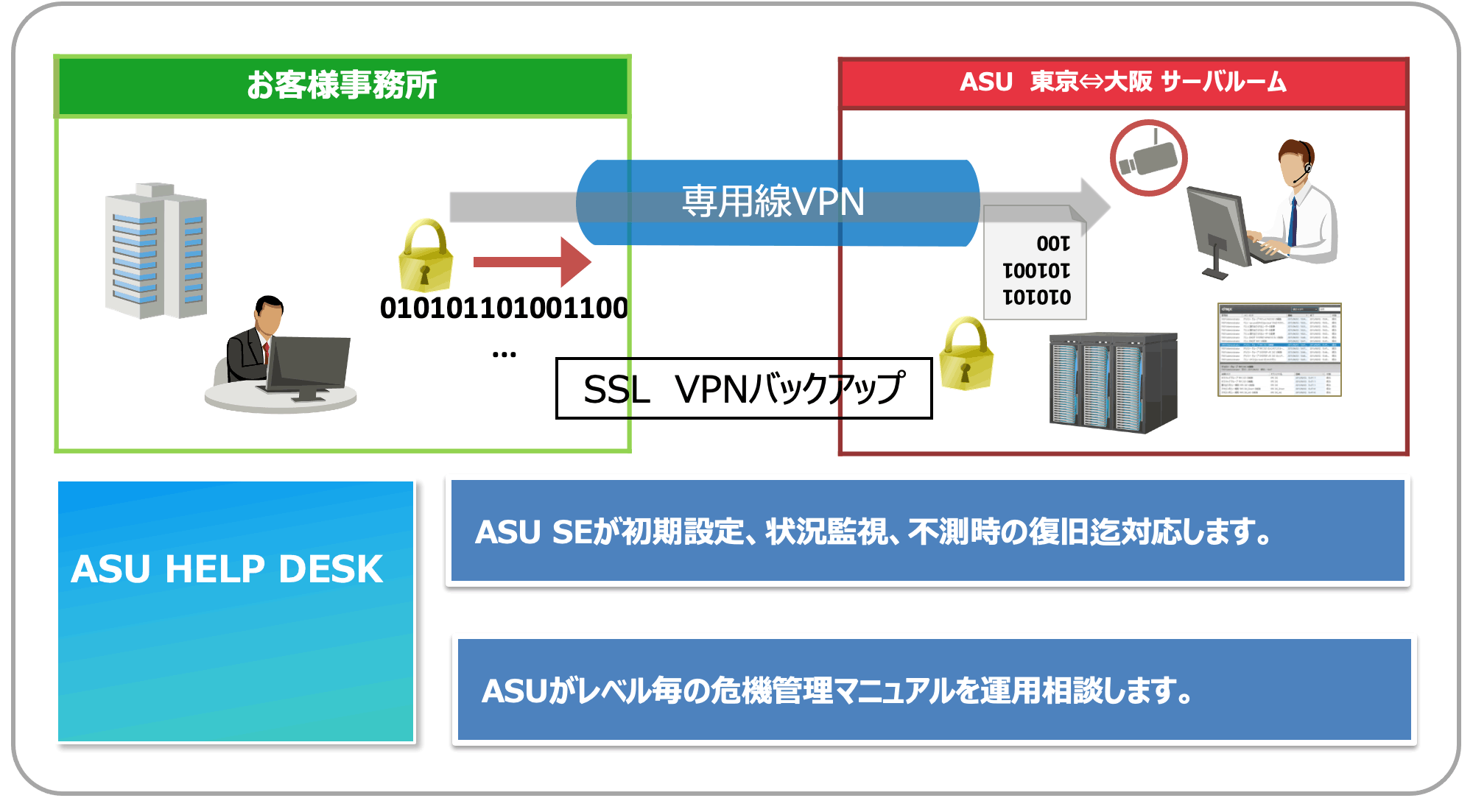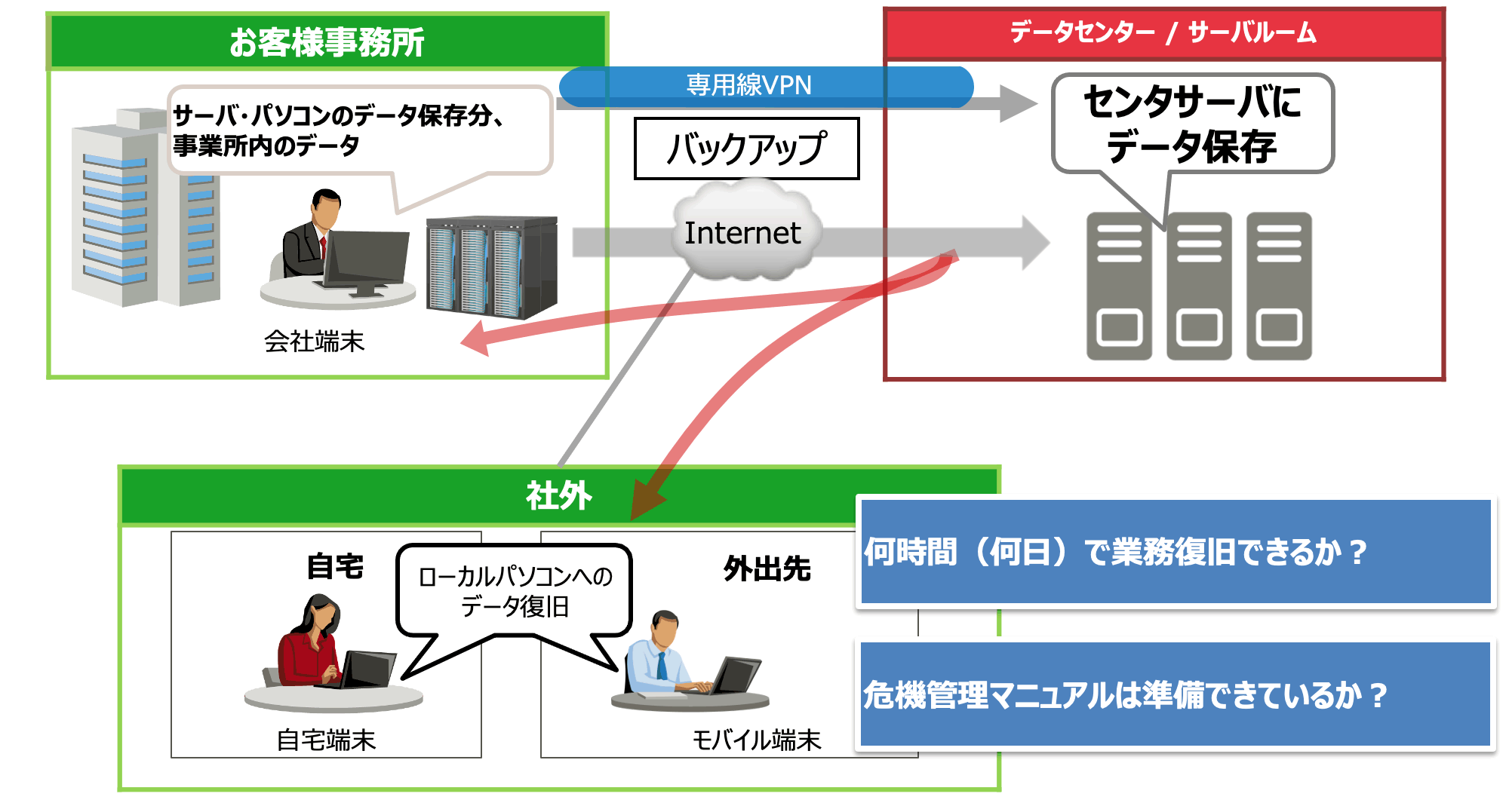 データセンターやサーバルーム環境にデータを日々バックアップし、様々なレベルの 災害・人災・パンデミックが発生しても事業継続(復帰)の対策をしておきます。