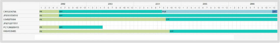 世界各国での優先権、出願、公開、登録等のタイミングチャート分析を行なえます。