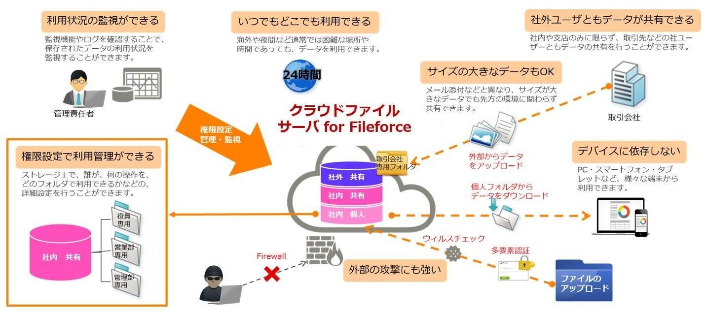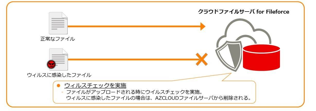 ファイルがウィルスに感染している場合は、クラウドファイルサーバ for Fileforceに保存されないため、ファイルサーバを経由してウィルスが広まるのを防止することができます。