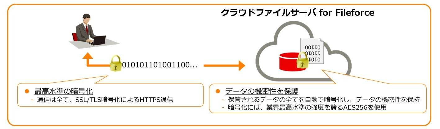 それらの重要情報の喪失や漏洩といったリスクを徹底して排除すべく、クラウドから通信経路、端末上に至るまで全てのファイルデータを複数レイヤーで暗号化しています。